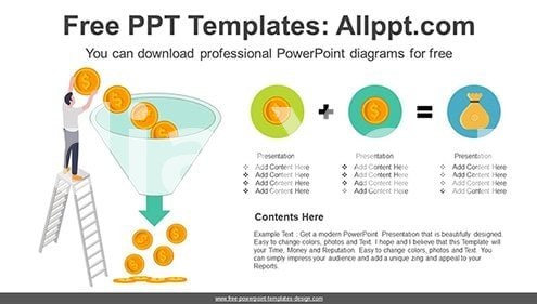 This diagram is a funnel design containing dollar coins. This is a solid linear financial diagram. It is also an editable graphic with text and icon placeholders.