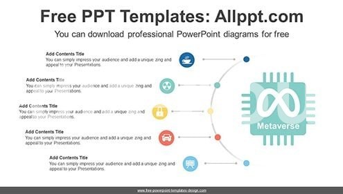 This is a semi-cycle diagram with five circles. This can summarize the five concepts derived from the metaverse. It is also an editable graphic with text and icon placeholders.